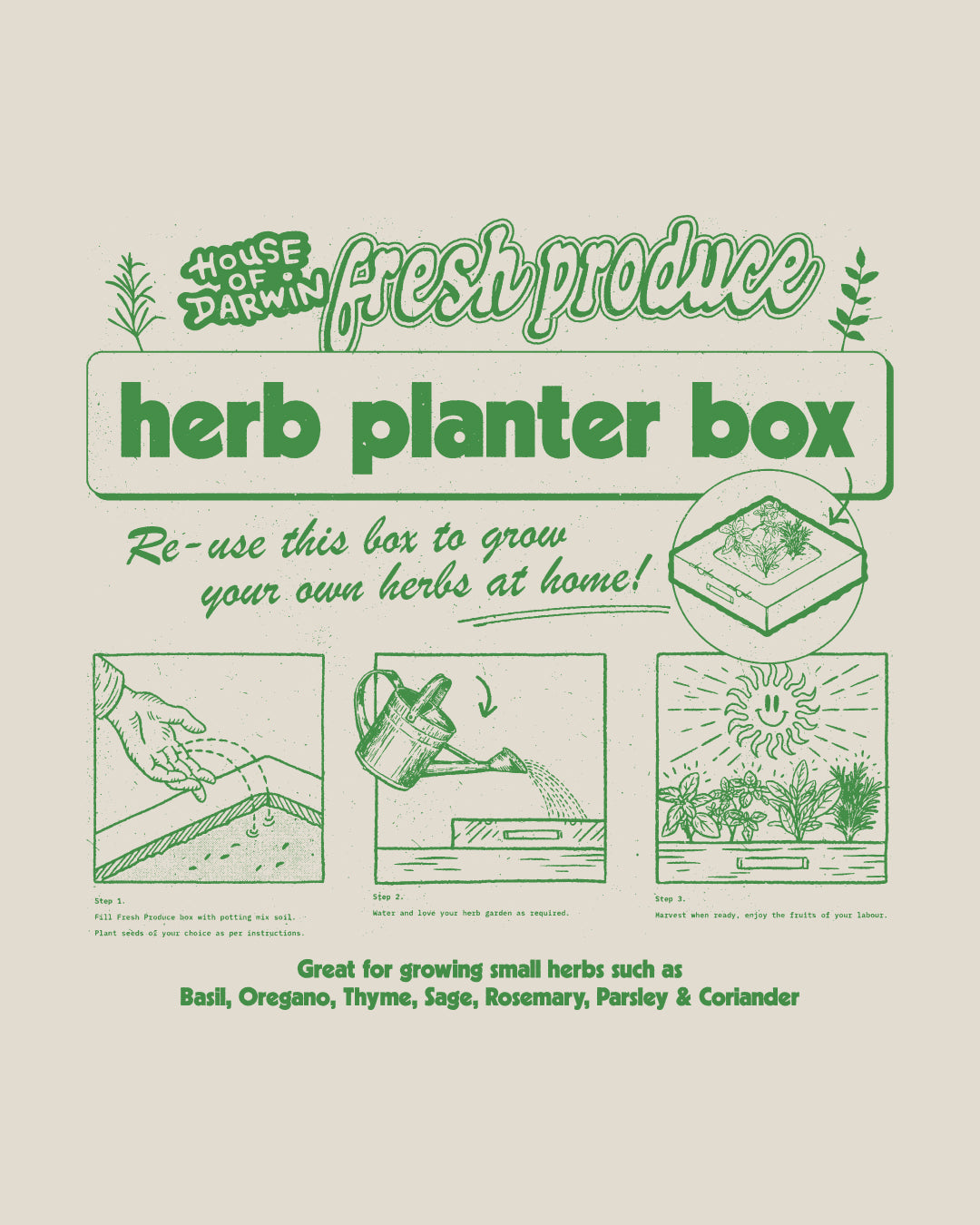 No throwaway packaging here. Our Fresh Produce range comes in a box that doubles as a herb planter. Add soil, sprinkle seeds and turn your tee box into a mini herb garden at home.
